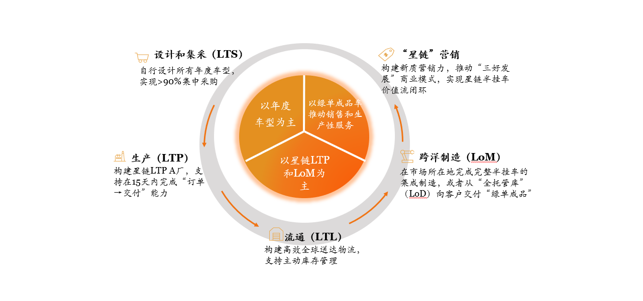 本公司具有跨洋制造優(yōu)勢,是全球為數(shù)不多的全品類半掛車生產(chǎn)企業(yè)。國內(nèi)LTP生產(chǎn)中心和屬地的輕資產(chǎn)LoM制造中心聯(lián)動,在物流發(fā)達區(qū)域構建成品庫,并打造區(qū)域業(yè)務集團和各國當?shù)氐姆ㄈ嘶癄I銷服務公司,將中國動力與當?shù)丨h(huán)境有機結合。在全球范圍內(nèi),本公司擁有21家“燈塔”工廠,并充分發(fā)揮全球各地的LoM工廠裝配能力,通過主動庫存模塊化的產(chǎn)品,快速從“全托管庫”(LoD)向客戶交付,形成了具有核心競爭力的跨洋運營模式,為全球市場各類業(yè)務增強了經(jīng)營韌性與抗風險能力。